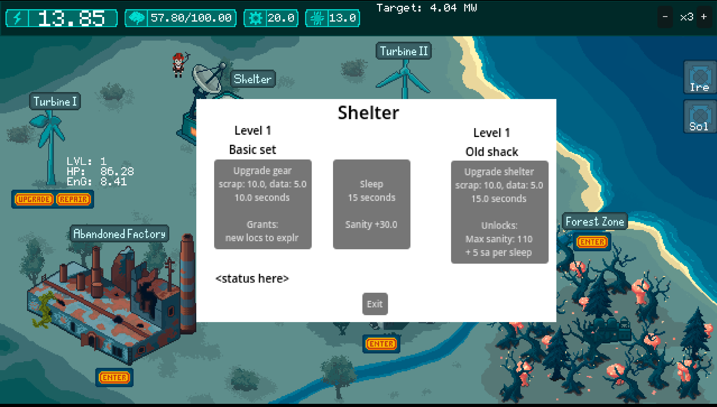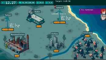 Short post-apocalyptic survival management sim. You play as Ire, a girl with a nagging AI partner living in her shoulder projector and a certain obsession to fix wind turbines in a long dead world.